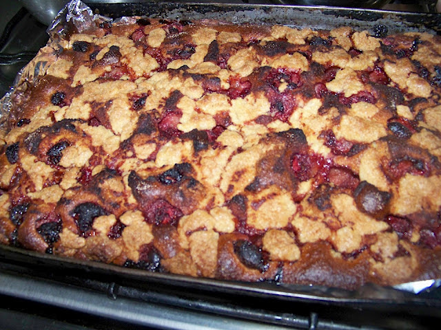 Ciasto wylewamy na blaszke wyłożoną folią,na nie dajemy owoce .Miękkie masło ucieramy z cukrem.Dodajemy mąke tak,by powstały grudki.Rozkładamy na owocach,Pieczemy 55 min. w 180 stopniach.